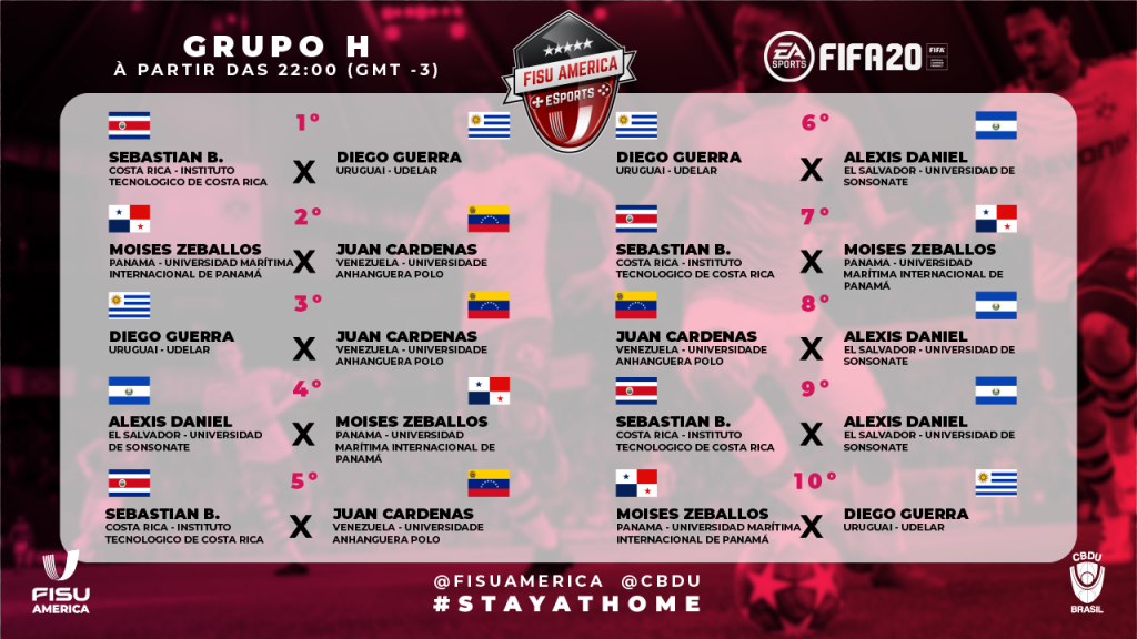 Os jogos serão transmitidos a partir das 22h, horário de Brasília (GMT -3), pelo canal do YouTube da FISU AMERICA. O FISU AMERICA eSports - FIFA 20, é uma iniciativa da FISU AMERICA, com apoio técnico da Confederação Brasileira do Desporto Universitário (CBDU).